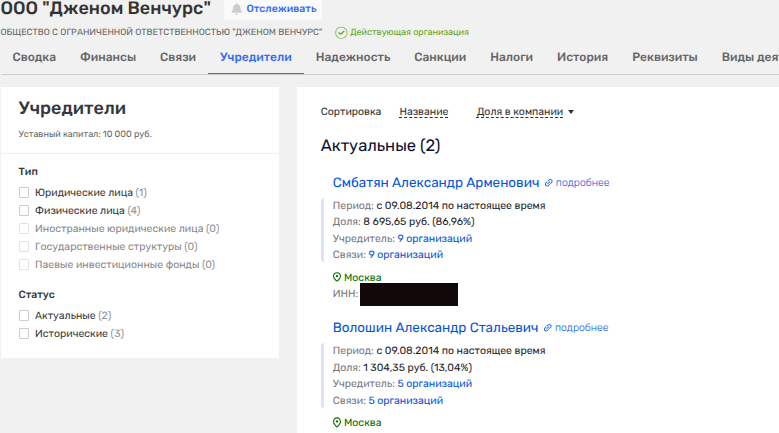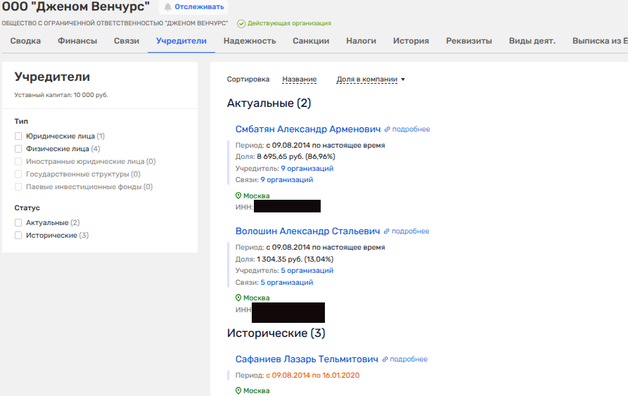 В ООО «Дженом Венчурс» Сафаниев был в числе совладельцев с 2014 года и вплоть до января 2020 года, а в ООО «Геном Венчурс» с 2016 года и по 2020 год. Но, вероятнее, всего этот выход не более чем попытка публично прикрыть связь Смбатян - Сергунина.