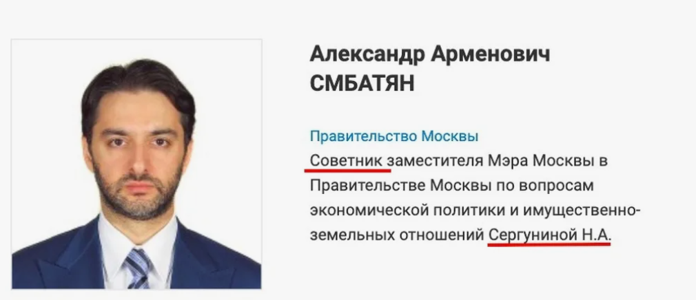 В биографии Смбатяна есть скромная строчка о том, что он консультирует администрацию города и ведущие предприятия страны по вопросам инновационной политики и технологического предпринимательства. Фактически же Смбатян до сих пор может являться советником вице-мэра Натальи Сергуниной, которая среди прочего курирует приватизацию, имущественно-земельные отношения. С сайта мэрии, между тем, портрет Смбатяна исчез, но сеть помнит всё.