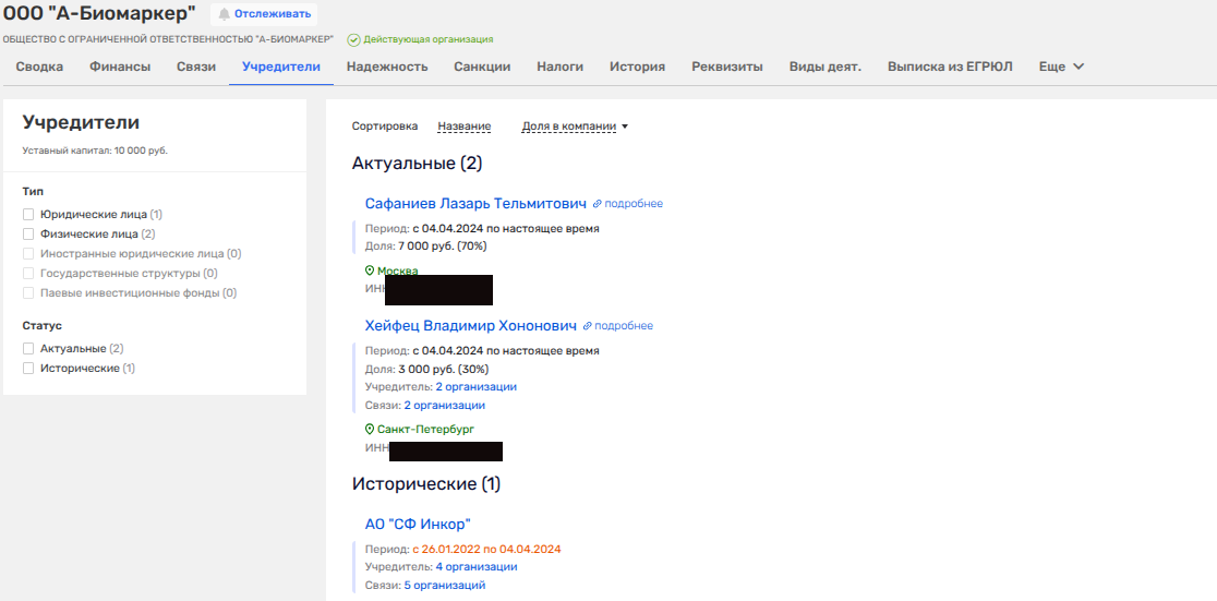 В то же время в «А-Биомаркер» мелькала компания, связанная с бывшим директором АО «ТТ Групп». Это еще один признак того, что Сафаниев не утратил связей с Смбатяном.