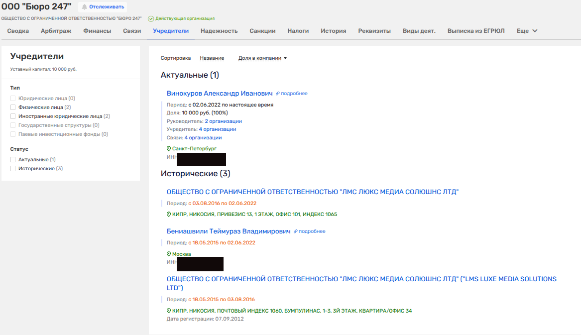 Фирма «Бюро 247» между тем ранее принадлежала офшору - кипрской LMS LUXE MEDIA SOLUTIONS LTD. Сегодня юридическим владельцев Александр Иванович Винокуров, который тесно связан с бизнесом Полины Юмашевой.
