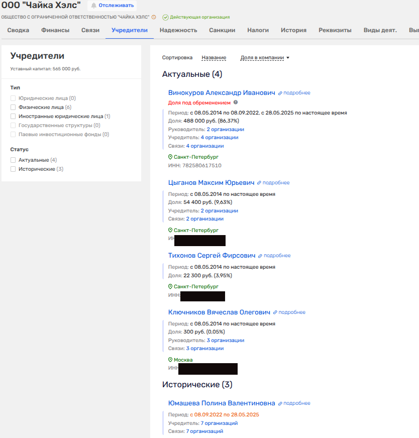 Именно Винокуров в мае 2025 года получил долю Юмашевой в ООО «Чайка Хэлс», которое контролирует целую пачку больничных компаний. Как тут не вспомнить бизнес-партнера Сафаниева - владельца сети клиник?