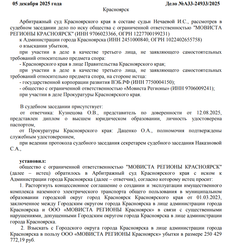 21 января 2026 года красноярский арбитраж рассмотрит иск ООО «Мовиста Регионы Красноярск» к администрации Красноярска. Третьими лицами в деле госкорпорация ВЭБ.РФ, правительство края. Иным лицом в деле присутствует и краевая прокуратура.