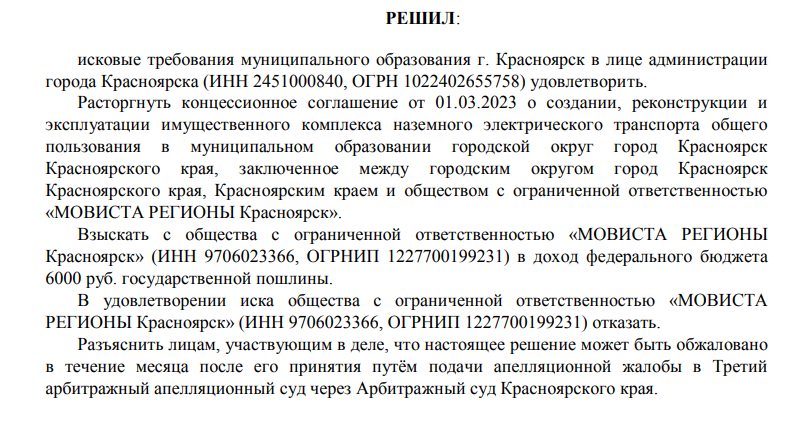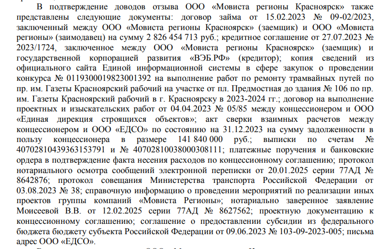 Еще в сентября 2025 года, было вынесено решение по делу о расторжении концессии, но там истцом выступала мэрия Красноярска. Новое дело - это выделенное производство, смысл которого решить спор о деньгах, что хотят бенефициары компании. При этом, вероятнее всего, речь о договоре займа с аффилированными фирме лицами, которые якобы профинансировали проект на старте. По факту же это выглядит как мутная выводная схема.