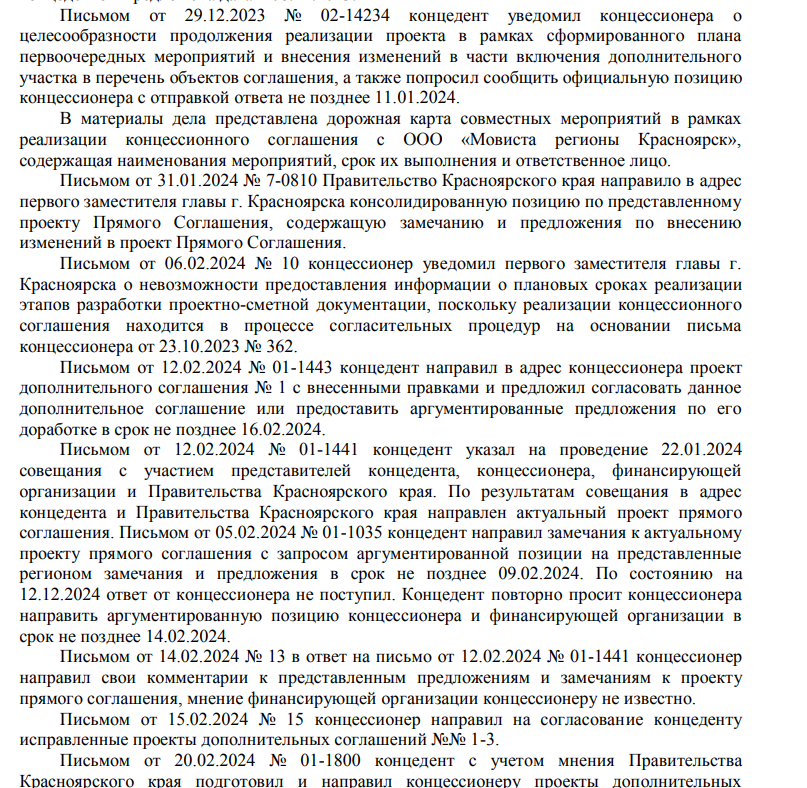 Но вместо того, чтобы приступить к концессии, «Мовиста» начала кормить мэрию Красноярска завтраками, стороны перекидывались письмами, но дело с мертвой точки так и не сдвинулось. В 2024 году этот эпистолярный роман продолжался. К финансированию также оставались вопросы.