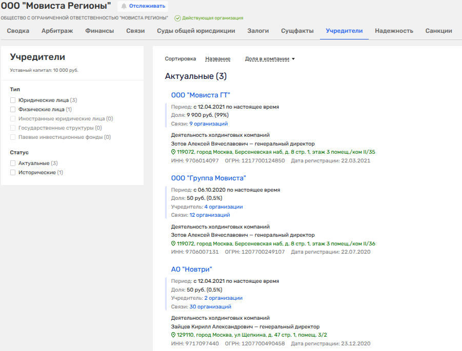 ООО «Мовиста Регионы Красноярск», имеющая в штате 0 сотрудников и копеечный уставный капитал в 100 тыс. рублей, а также демонстрирующая убыток в 42 млн рублей, принадлежит как раз ООО «Мовиста Регионы», что якобы давала ей взаймы.