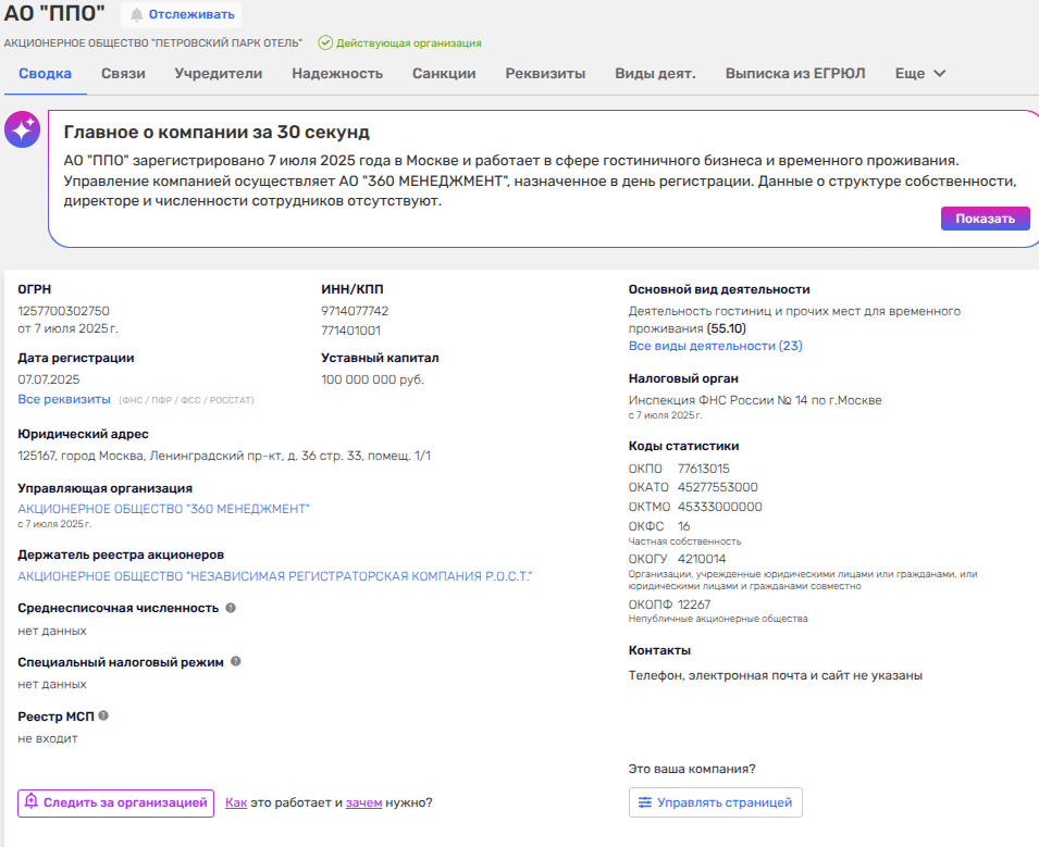 Стало известно, что в октябре 2025 года структуры ВТБ, коей рулит одиозный Костин, слили один из дорогих активов, которые они называют непрофильным - гостиничный комплекс Hyatt Regency Moscow Petrovsky Park на 298 номеров. Покупателем стала абсолютно мутная шарашка, учрежденное в июле 2025 года АО «Петровский парк отель» (ППО), чьи учредители скрыты еще на старте. Уставный капитал - 100 млн рублей.