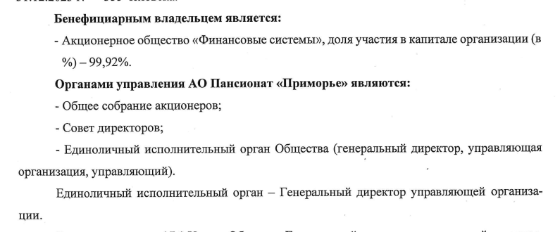 По данным на конец 2024 года владельцем 99,9% доли в АО «Пансионат с лечением «Приморье» было АО «Финансовые системы». Последнее было трансформировано из одноименного ООО, которым владели мать вице-премьера Дениса Мантурова Тамара Мантурова и компания «Финансовые инвестиции» Станислава Чемезова - сына главы госкорпорации Ростех Сергея Чемезова. И хотя АО не раскрывает бенефициаров, вряд ли что-то поменялось, так как директора они не меняли.