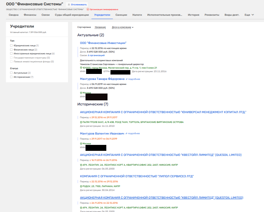 Тут следует отметить, что в ООО «Финансовые системы» успели наследить и офшоры с Британских Виргинских островов и Кипра. Например, QUESTOIL LIMITED, GUYLEN INVESTMENTS LIMITED, Universal Management Capital Ltd и т.д. Часть этих кубышек наследила и в биографии винодельни «Мантра», связанной с теми же высокими семействами. Вероятно, через эти ручейки Мантуров и Чемезов создали себе запасные полигоны на старость, где-нибудь на Кипре или островах потеплее.