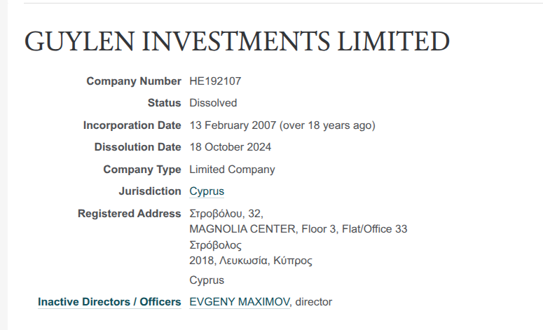 Занятно: GUYLEN INVESTMENTS LIMITED было ликвидировано лишь в октябре 2024 года, а директором был EVGENY MAXIMOV. Он же руководит и АО «Финансовые системы». В то же время тезка Максимова имел отношение к немецкой фирме VAH Sibirien UG (ныне ликвидирована).