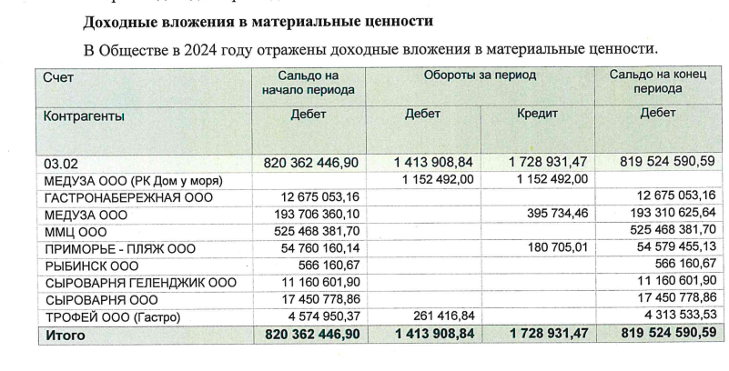 Так, исходя из отчета за 2024 год, мы видим, что пансионат вкладывал деньги в разные проекты и один из таких проектов ООО «Сыроварня Геленджик» Антона Долотина - того, кто владел ООО «360 Менеджмент» до Васина, то есть рулил активами высоких семейств. При этом с Васиным у Долотина был бизнес и помимо УК.