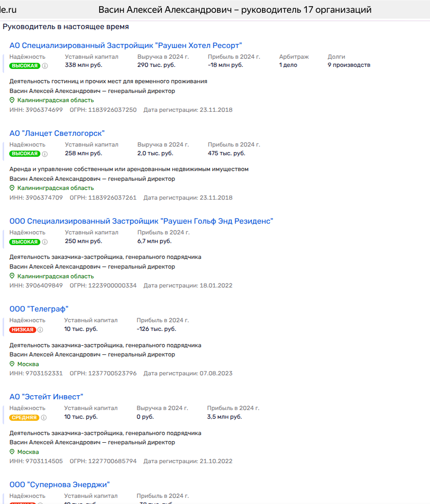 Кстати, Васин, похоже, рулит калининградским и нижегородским бизнесом высоких семейств. Например, АО Специализированный застройщик «Раушен Хотел Ресорт» в Калининградской области - застройщиком двух домов в Светлогорске (ЖК PROMENADE), которые относятся к элитному классу и расположены на первой линии Светлогорского взморья - и занимает почти полтора километра прибрежной территории, то есть эдакий домик для своих.