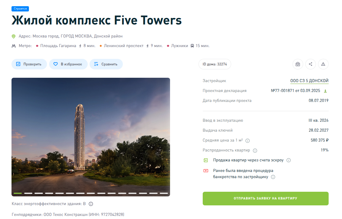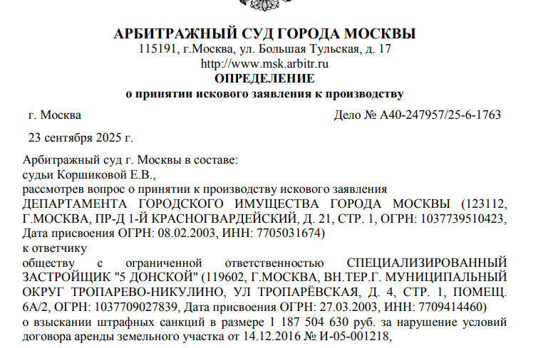 С мутной девелоперской шарашки команда Собянина в лице департамента горимущества Москвы требует 1,1 миллиард рублей штрафа за нарушение условий аренды земли. Ответчик - девелопер ЖК Five Towers ООО СЗ «Донской 5». Заседание назначено на 1 декабря.