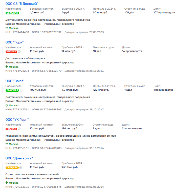 Кстати, похоже тандем Блажко-Мусатов уже озаботились новой ширмой - в августе 2024 года было учреждено строительное ООО «Донской 2», где Блажко - директор, а мусатовское ООО «Арго» - владелец. Пока фирма лежит в загашнике про запас. Видимо, на случай, если ООО СЗ «Донской 5» снова обложат кредиторы?