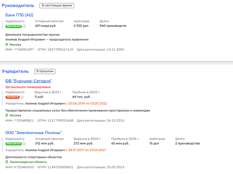 Самое занятное, что ранее в числе владельцев ООО «Земляничные поляны» мы видим не только кипрское ARBARO INVESTMENTS LIMITED, но и Андрея Акимова - нынешнего главу правления того самого спонсирующего частный гольф-клуб государственного Газпромбанка.