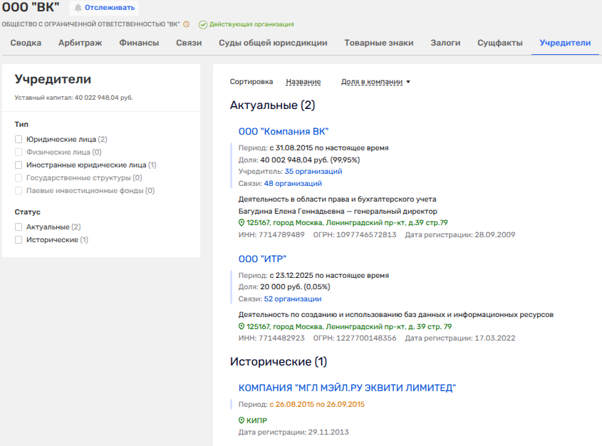 На тот момент фирма прятала уши своих бенефициаров за целой цепочкой офшорных кубышек - МГЛ МЭЙЛ.РУ ЭКВИТИ ЛИМИТЕД с Кипра, MAIL.RU GROUP LIMITED и ВК КОМПАНИ ЛИМИТЕД с Британских Виргинских островов. Их лишь в 2023 году прописали в российском офшоре.