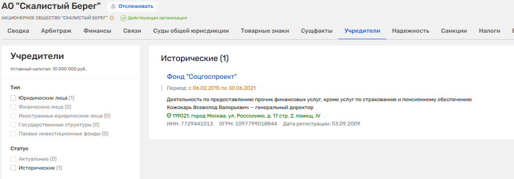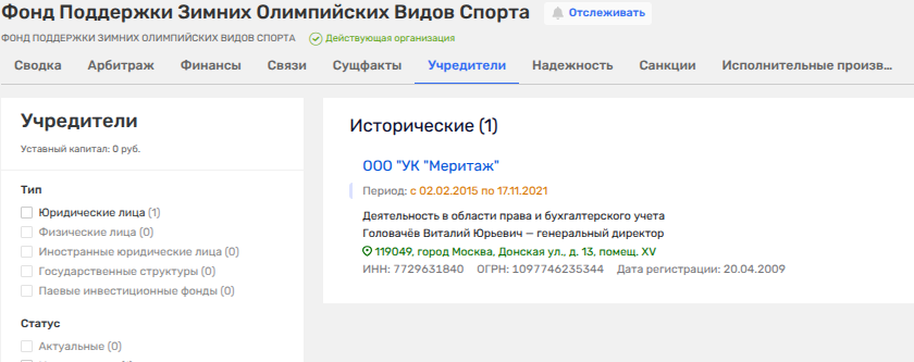 И вот же какое совпадение: в отчетности 2024 года АО «Скалистый берег» среди связанных сторон, в том числе по договорам займа, фигурирует ООО «ФинконсалтингК». Последнее принадлежит Фонду поддержки зимних Олимпийских видов спорта, чьим учредителем было некое ООО УК «Меритаж» Виталия Головачёва.