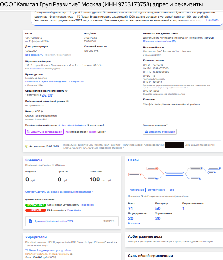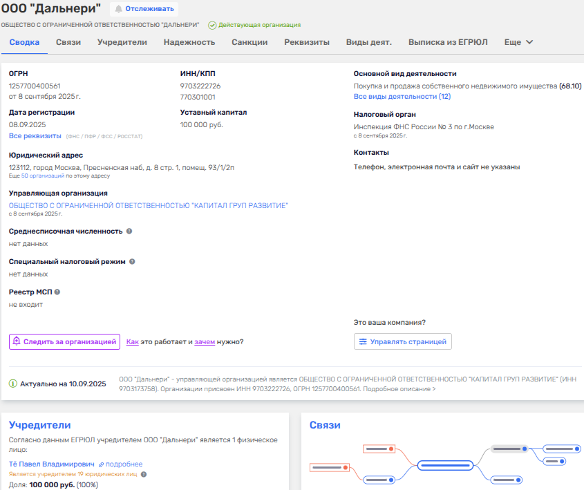 За август-сентябрь 2025 года Павел Тё и связанные с ним компании учредили четыре юрлица. Последнее - ООО «Дальнери» создано буквально на днях, 8 сентября.