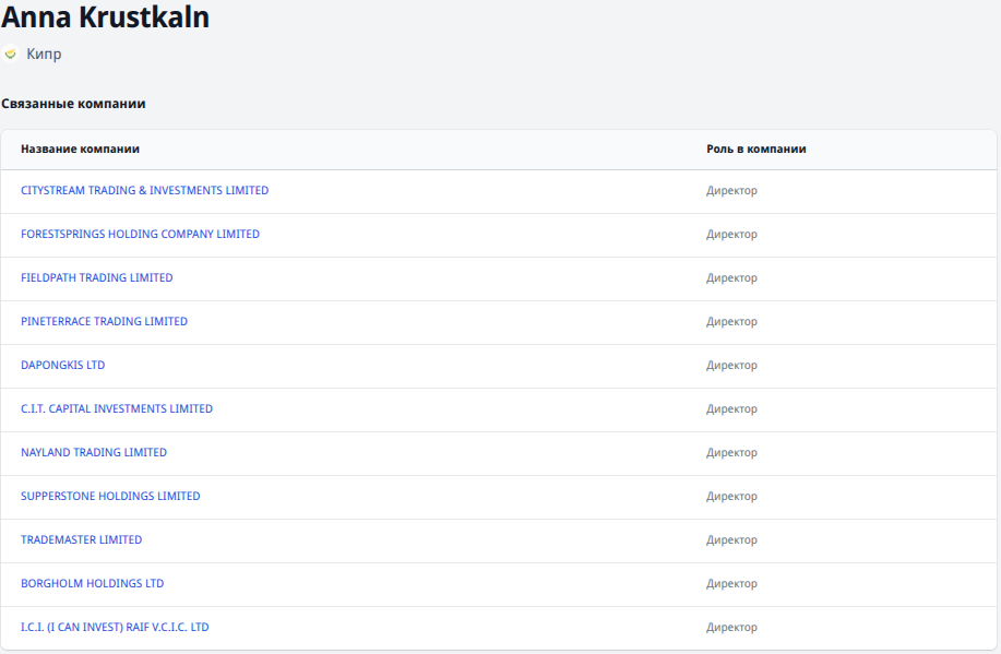 Директором последней на сегодня является ANNA KRUSTKALN, которая связана с целой пачкой иных фирм с пропиской на Кипре, включая SUPPERSTONE HOLDINGS LIMITED. Также г-жа Krustkaln была директором ООО «ИнвестМаркетинг», которое до марта 2024 года принадлежало именно Тё.