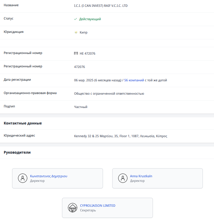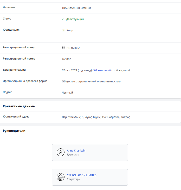 Таким образом мадам Krustkaln вполне может быть связным Тё по кипрской линии. В свете этого создание в марте 2025 года свеженького юрлица - I.C.I. (I CAN INVEST) RAIF V.C.I.C. LTD под крылом этой же дамы начинает играть новыми красками, как и учрежденное в октябре 2024 года TRADEMASTER LIMITED. А если сюда добавить буквально конвейерную штамповку новых российских юрлиц Тё, картинка становится всё более интересной.