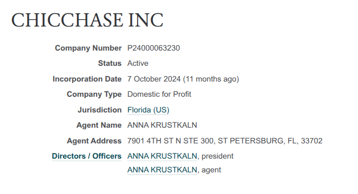 И что интересно, всё та же ANNA KRUSTKALN стала директором созданной в октябре 2024 года в США CHICCHASE INC. Может быть, компания, прописанная во Флориде, также не чужая г-ну Тё?