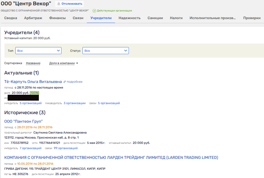 Помимо этого, Сауткина - директор ООО «Центр Векор», которое ныне принадлежит Ольге Тё-Карпуть. Ранее в биографии фирмы наследило другое кипрское юрлицо - некое LARDEN TRADING LIMITED, ликвидированное лишь в декабре 2024 года.