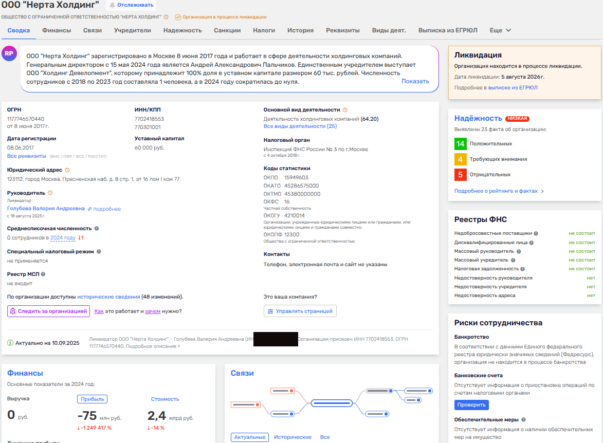 Что интересно: с одновременной штамповкой свежих ООО, дивизион Тё хлопает как мух уже отработанный материал. Так, к примеру, в августе 2025 года под нож отправлено ООО «Нерта Холдинг». Фирма по итогам 2024 года оценивалась в 2,4 млрд рублей.