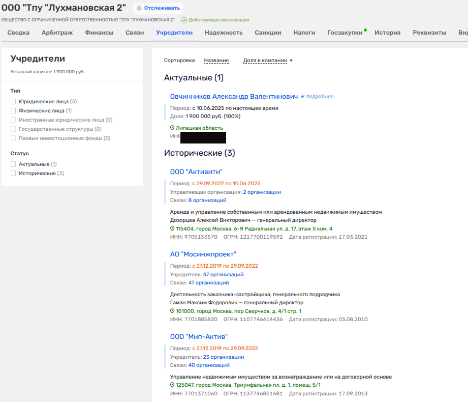 Кстати, видимо, чтобы этот вопрос задавали поменьше - в июне 2025 года ООО «Активити» перестало на бумаге быть владельцем ООО ТПУ «Лухмановская 2». Новым собственником юридически стал человек, подозрительно похожий на прикрытие-номинала - некий Александр Овчинников. Иных активов у него нет, а от продажи прошлых ему вряд ли удалось выручить существенную сумму. Тем более, в пользу версии о ширме говорит и то, что ООО «Активити» осталось управляющей для ТПУ «Лухмановская 2».