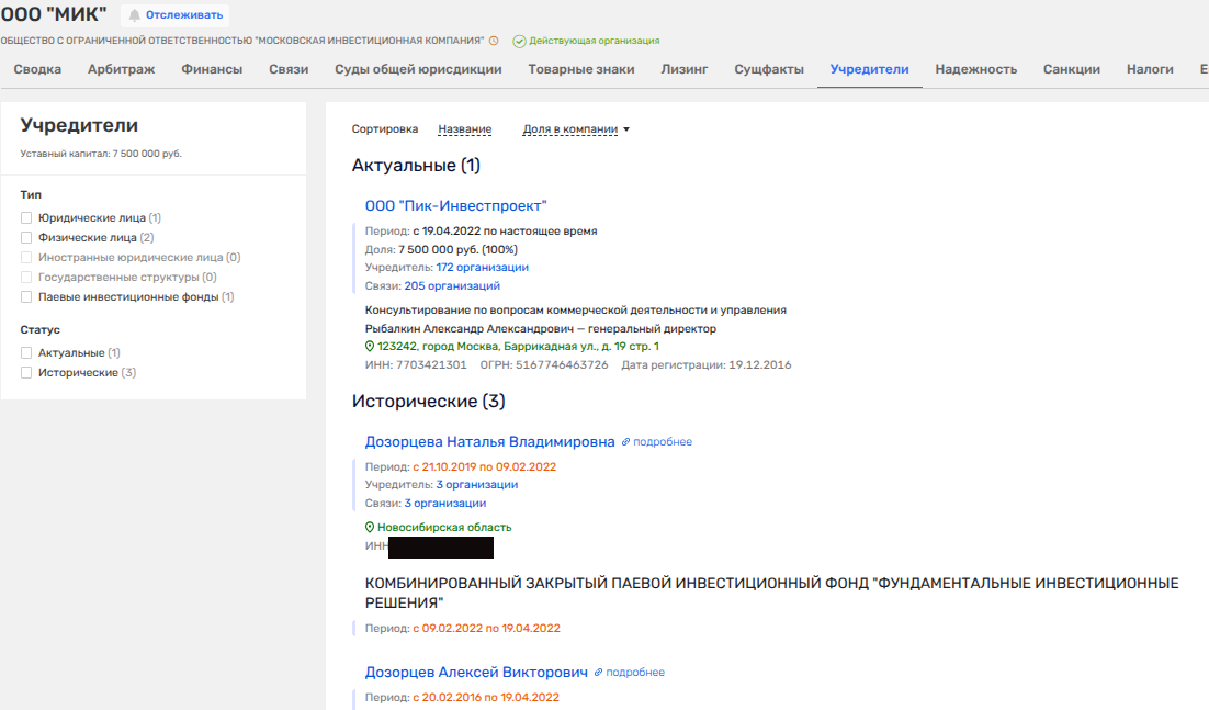 Дозорцев и его родственница Наталья Дозорцева с ООО «ПИК-Инвестпроект» пересекались через ООО «МИК» («Московская инвестиционная компания»).