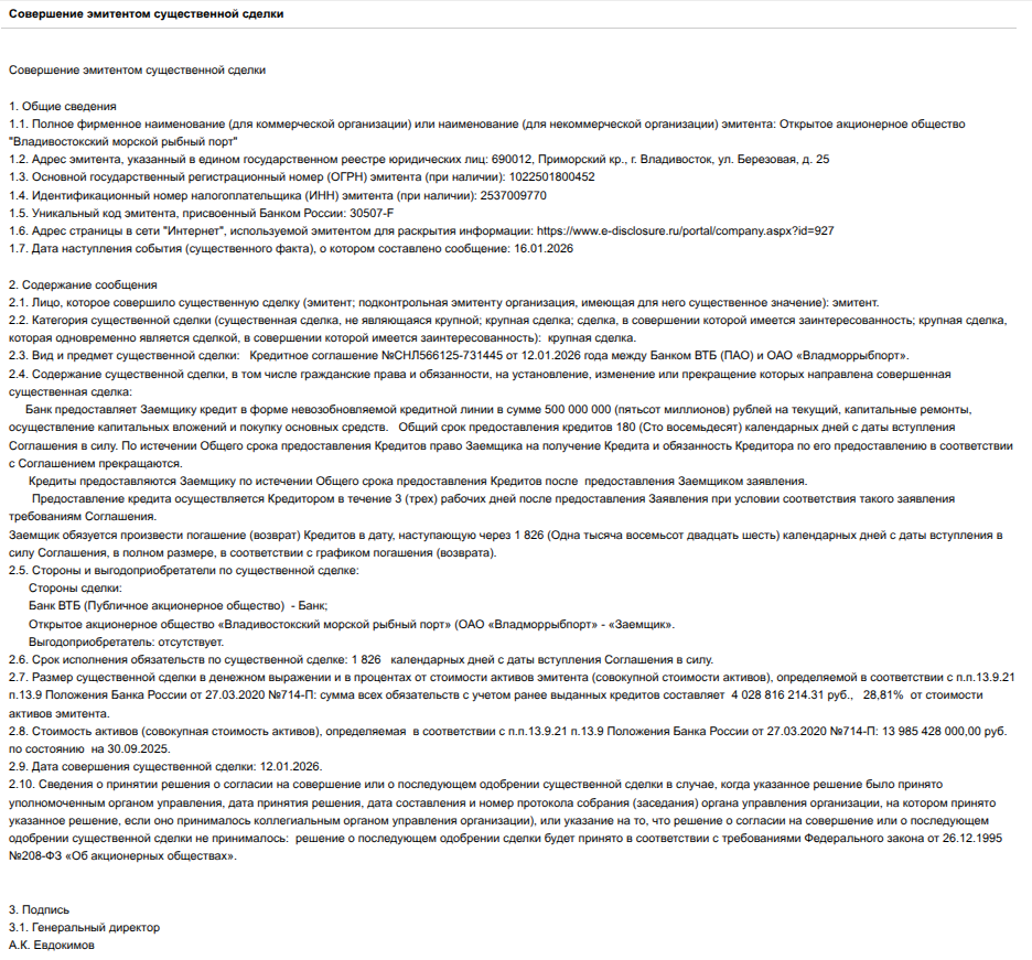 ВТБ 12 января 2026 года подмахнул Владморрыбпорту, где директором и основным акционером с долей 47,69% доверенное лицо Кожемяко - Александр Евдокимов, кредит на 0,5 млрд рублей. Интрига в том, что 3,5 месяца назад порт с подачи Евдокимова собрался выкупить доли семьи экс-губернатора Приморья Дарькина, тем самым получив за счет денег порта полный контроль над активом.