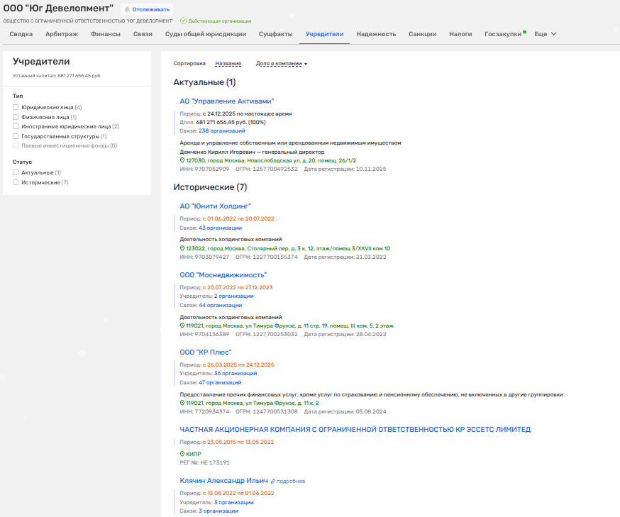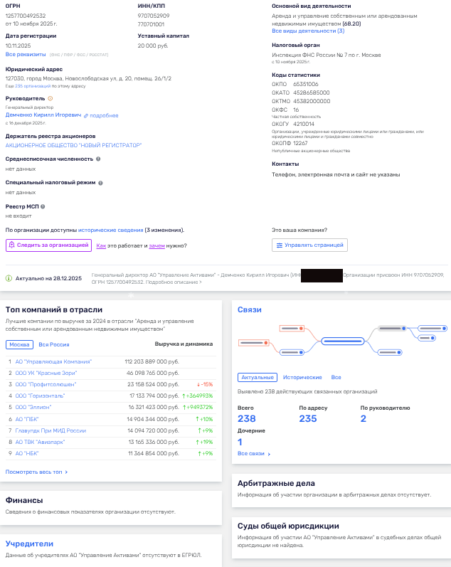 Покупатель ООО «Юг Девелопмент» - АО «Управление активами» также весьма примечателен. Он создан словно бы под эту сделку - 10 ноября 2025 года и с момента создания скрывает даже учредителей, а не только акционеров/бенефициаров. Но на них может навести персона директора - Кирилла Демченко.