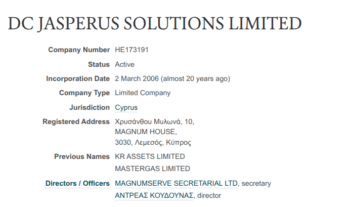 А еще в анамнезе ООО «Юг Девелопмент» довольно долго присутствовала кипрская кубышка - частная акционерная компания с ограниченной ответственностью КР Эссетс Лимитед, которая до сих пор действующая. Но чтобы замылить следы, ей сменили название на DC JASPERUS SOLUTIONS LIMITED. Управляют ею и еще пачкой связанных кипрских активов наемные директор и секретарь, из тех, которых зовут техническими.