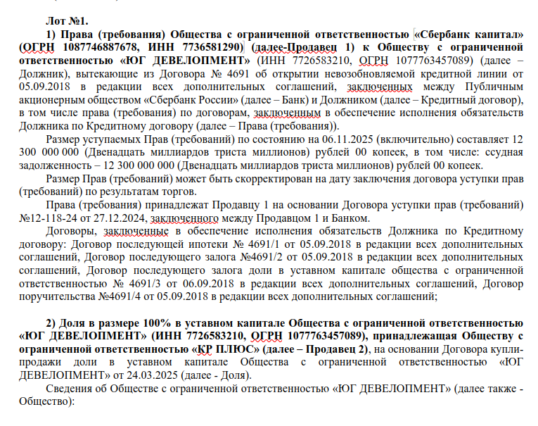 Перейдем к новым владельцем ООО «Юг Девелопмент», которая продавалась с торгов единым лотом с правом требования к ней 12,3 млрд рублей - долгов по кредитам все того же Сбербанка. Цену сделки пока не раскрывали, но минимальная стоимость единого лота была 12,3 млрд рублей, максимальная - 17,1 млрд рублей.