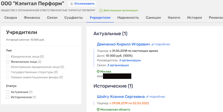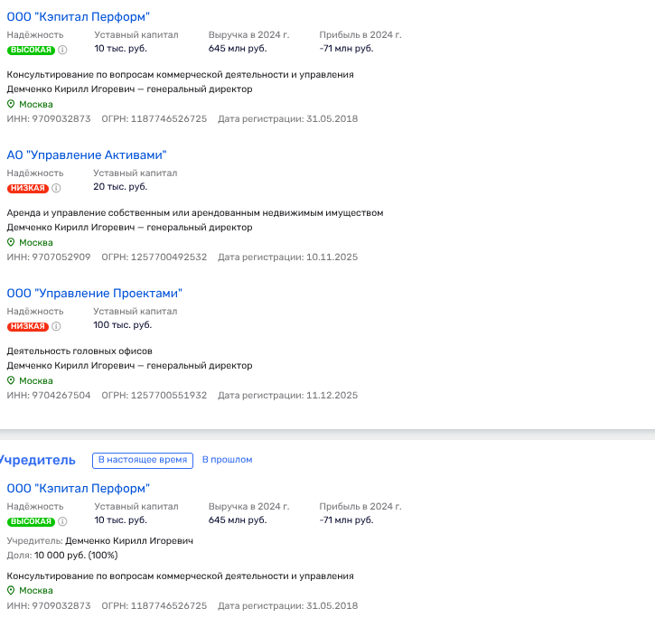 Демченко не только директор, но и владелец ООО «Кэпитал Перформ», которое хоть и демонстрирует убытки, но представляет интерес его бизнес-партнером. Владельцем доли в 2019-2022 годы была Ксения Сергеевна Шойгу - дочь бывшего главы МЧС РФ, экс-министра обороны, а ныне секретаря Совбеза России Сергея Шойгу.