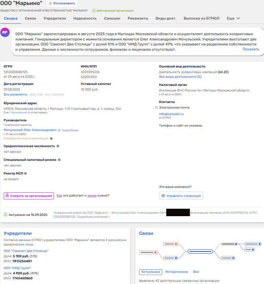 В конце августа 2025 года в ЕГРЮЛ появилось новое юрлицо - ООО «Марьино», которое, вероятнее всего, еще одна кубышка для осваивания территории Марьино, кою застраивает ГК Самолет.