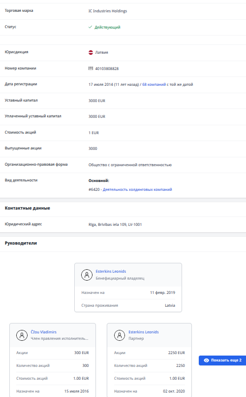 А еще Клименко ранее имел в своем активе латвийскую кубышку - IC Industries Holdings, членом правления оной был тогда Čžou Vladimirs, тесно связанный с латвийским олигархом Леонидом Эстеркиным (Esterkins Leonids). Последний ныне и числится бенефициаром бывшего актива Клименко.