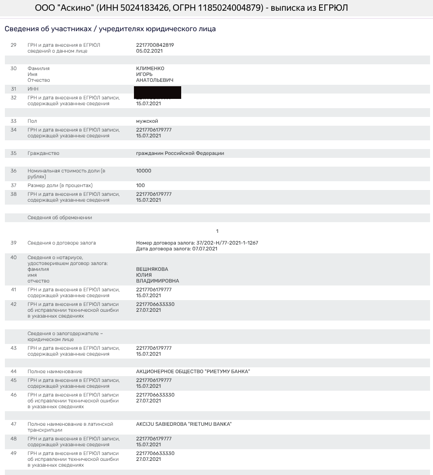 Еще один занятный факт: у Клименко с 2021 году в активе появилось некое ООО «Аскино» и его доля заложена все тому же латвийскому ландромату - Rietumu Banka. Это намекает на крепкие прямые связи бизнесмена в не дружественной РФ Латвией. При этом получил он этот бизнес от некоего Сергея Ромашкина. Вероятно, родственника семьи супруги, экс-вице-мэра Рязани Юрия Ромашкина.