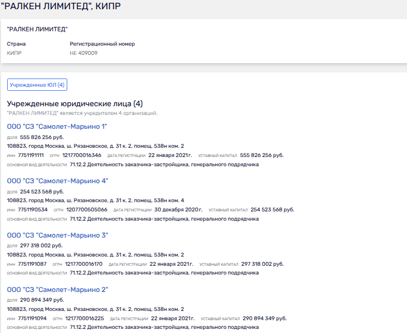 Так, на сегодня Мочульский - директор ООО СЗ «Самолет-Марьино 1», которое принадлежит кипрской кубышке RALKEN LIMITED. На офшор же оформлено несколько кубышек со схожим наименованием.