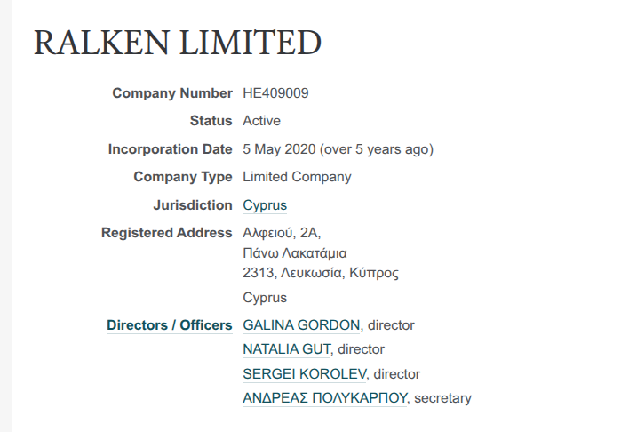 При этом среди директоров RALKEN LIMITED вполне себе русскоязычные фамилии - GALINA GORDON, NATALIA GUT, SERGEI KOROLEV.