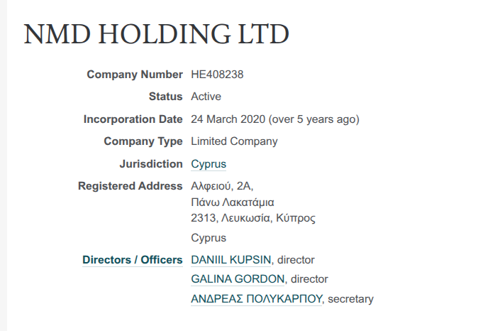 Мадам Гордон также менеджер американской компании по недвижимости - 310 N CLINTON M, LLC и директор кипрской NMD HOLDING LTD, где мы обнаруживаем среди ее партнеров уже известного DANIIL KUPSIN.