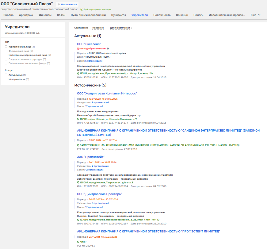 В августе 2025 года ООО «Силикатный Плаза» был выкуплен у Интерроса олигарха Потанина. При этом в анамнезе фирмы наследила парочка кипрских кубышек - SANDIMON ENTERPRISES LIMITED и ПРОФЭСТЕЙТ ЛИМИТЕД. Видимо, в свое время помогали выводить капиталы миллиардеры от сдачи помещений.