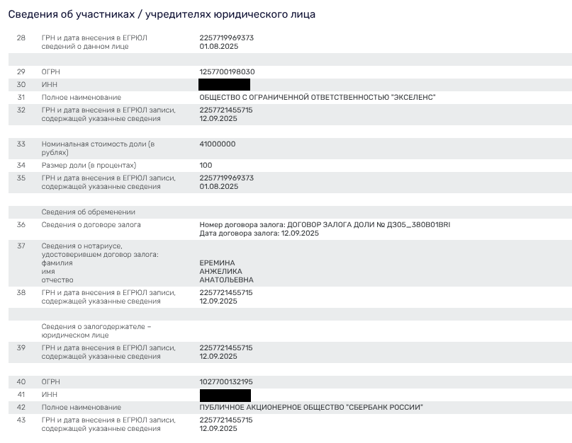Доля ООО «Экселенс» с сентября 2025 года заложена Сбербанку, как и доля ООО «Управление Активами». Это намекает на то, за чей счет будут строить объект, а то и покупали кубышку.