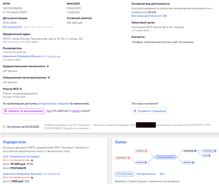 Покупателем стало ООО «Экселенс», сляпанное в конце апреля 2025 года. 99% доли в фирме принадлежит убыточному ООО «Управление Активами», созданному в 2023 году. Так откуда деньги на не мелкую покупку у Потанина, спросите вы?
