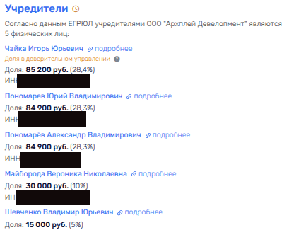 В копилку этого мнения играет и то. что директором ООО «Экселенс», «Управление Активами» и двух клонов - «Архплей Девелопмент» является один и тот же человек, которому выделили небольшие дольки - Владимир Шевченко. Более того, в одном из ООО «Архплей Девелопмент» он же является единственным владельцем. Зачем понадобилось плодить клонов, если не для мутных операций?