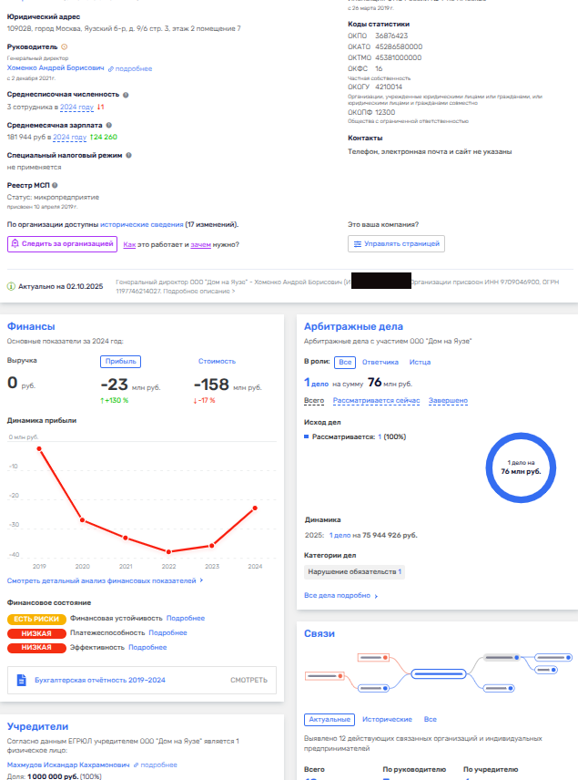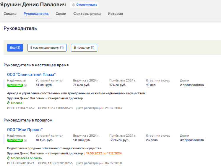 Так веженазначенным директором ООО «Силикатный Плаза» после сделки стал Денис Ярушин, который до декабря 2024 года был руководителем «ЖСИ Проект». И кого только не было во владельцах этой кубышки: от экс-главы Рузского района Максима Тарханова, арестованного по подозрению в хищении 500 млн бюджетных рублей, до Любови Комиссаренко - супруги Пономаренко.