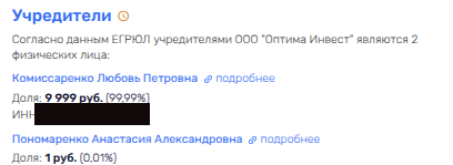 До сих пор в «ЖСИ Проект» 55% доли через «Оптима Инвест» имеют Любовь Комиссаренко и Анастасия Александровна Пономаренко.