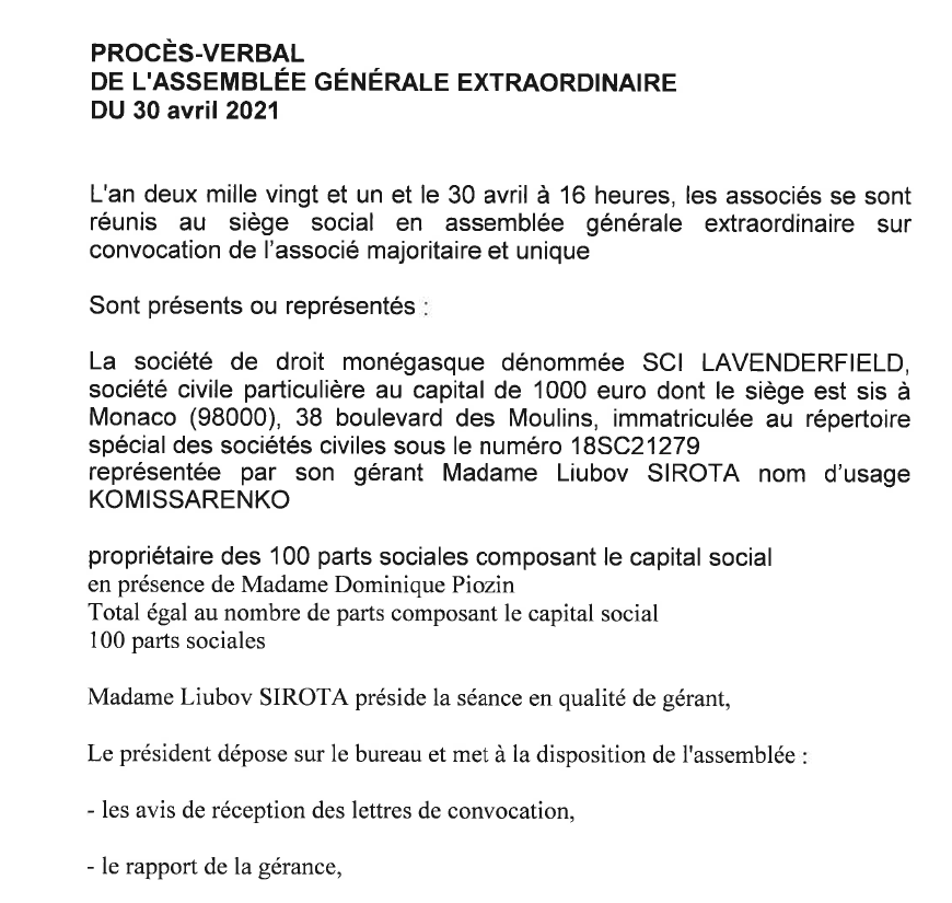 Что касается Комиссаренко, то на нее и детей чиновника во Франции записан бизнес - ANASTASIA и Alexander et Fils. В создании ANASTASIA принимала участие и фирма из Монако - SCI LAVENDER FIELD в лице представителя Любови Комиссаренко.