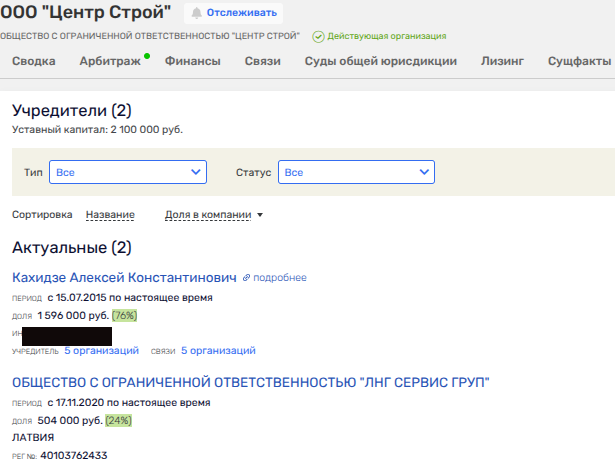 Так, Алексей Кахидзе контролирует ООО «Центр Строй», которое за 2024 год показало 222 млн рублей выручки, но при этом не доплатила в бюджет 1,4 млн рублей налогов. Владеет этой фирмой он с «ЛНГ Сервис Груп» из Латвии. На минуточку, Латвия одна из самых не дружественных РФ стран.