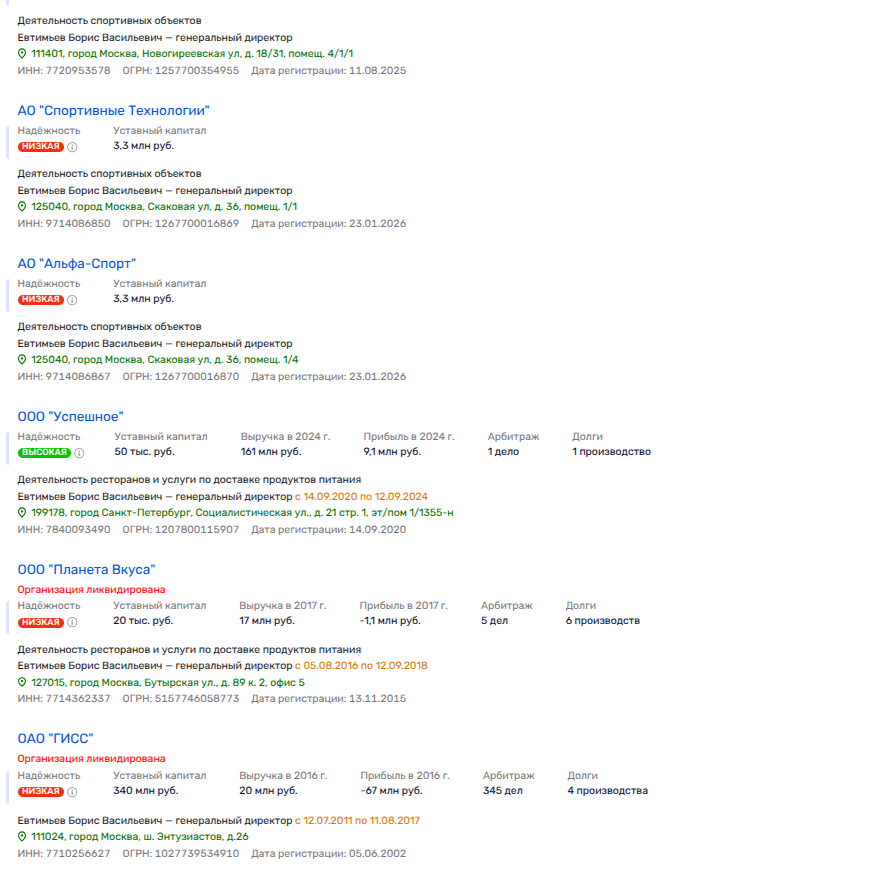 Всеми этими кубышками, а также созданными в июне и августе 2025 года АО «Проектные решения» и ООО «Спортивные инвестиции» того же Погребенко и в той же сфере рулит Борис Евтимьев. Последний - это еще один бывший чиновник, ранее связанный с департаментом имущественных отношений Москвы (ДИГМ). Так, в 2011-2017 годы Евтимьев руководил ОАО «Городская информационно-справочная служба», учрежденным ДИГМ.