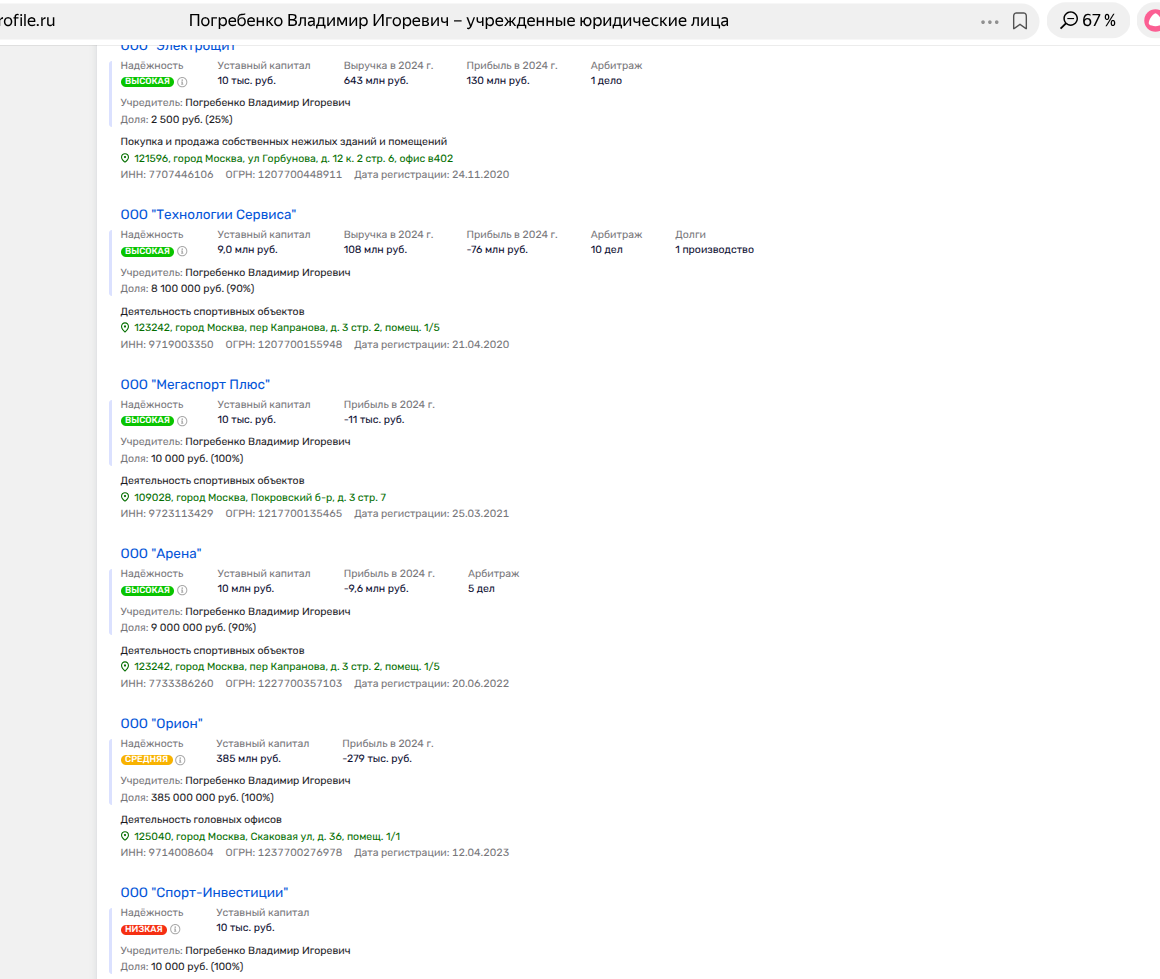 На сегодня на Погребенко оформлено три десятка юрлиц, но львиная доля их связана с деятельностью спортобъектов и управлением недвижимостью.