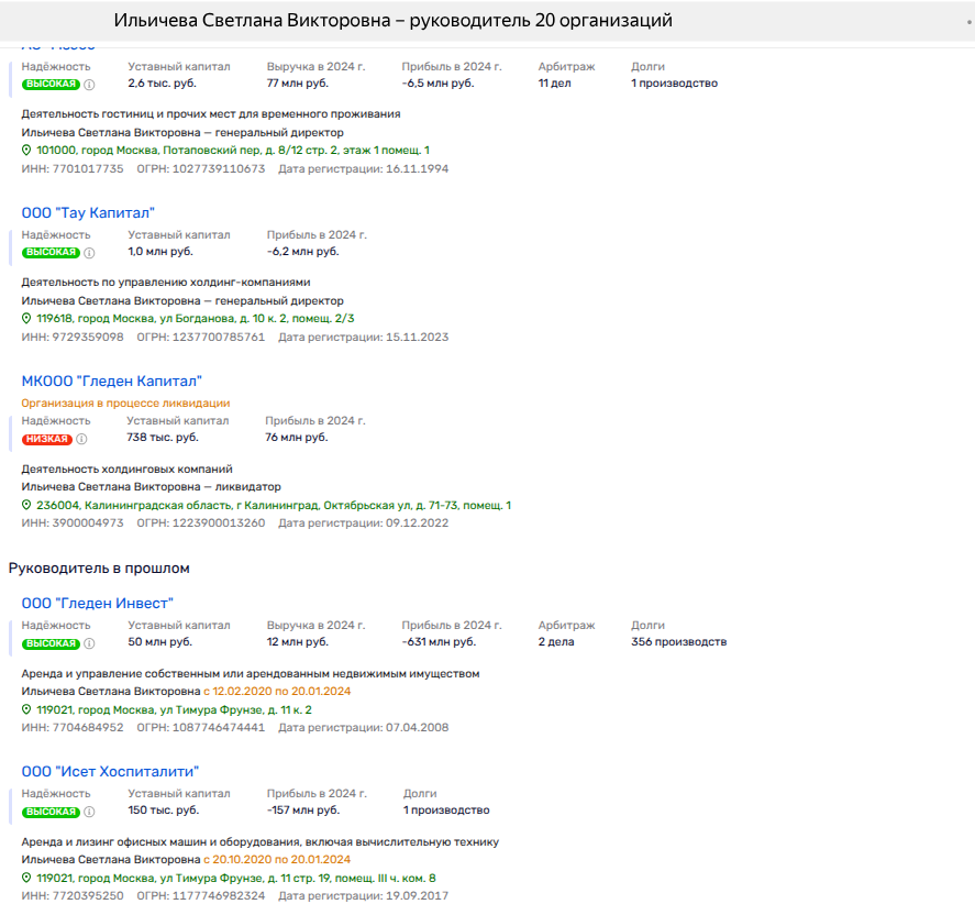 Ильичева до сих пор директор МКООО "Гледен Капитал" (бывшего одноименного кипрского юрлица), оформленного на фирмы, связанные с Клячиным, ставшим фигурантом иска Генпрокуратуры РФ к банкиру Хотину. Тогда по иску надзорного ведомства активы Клячина были национализированы, но позднее отельеру разрешили выкупить их обратно.